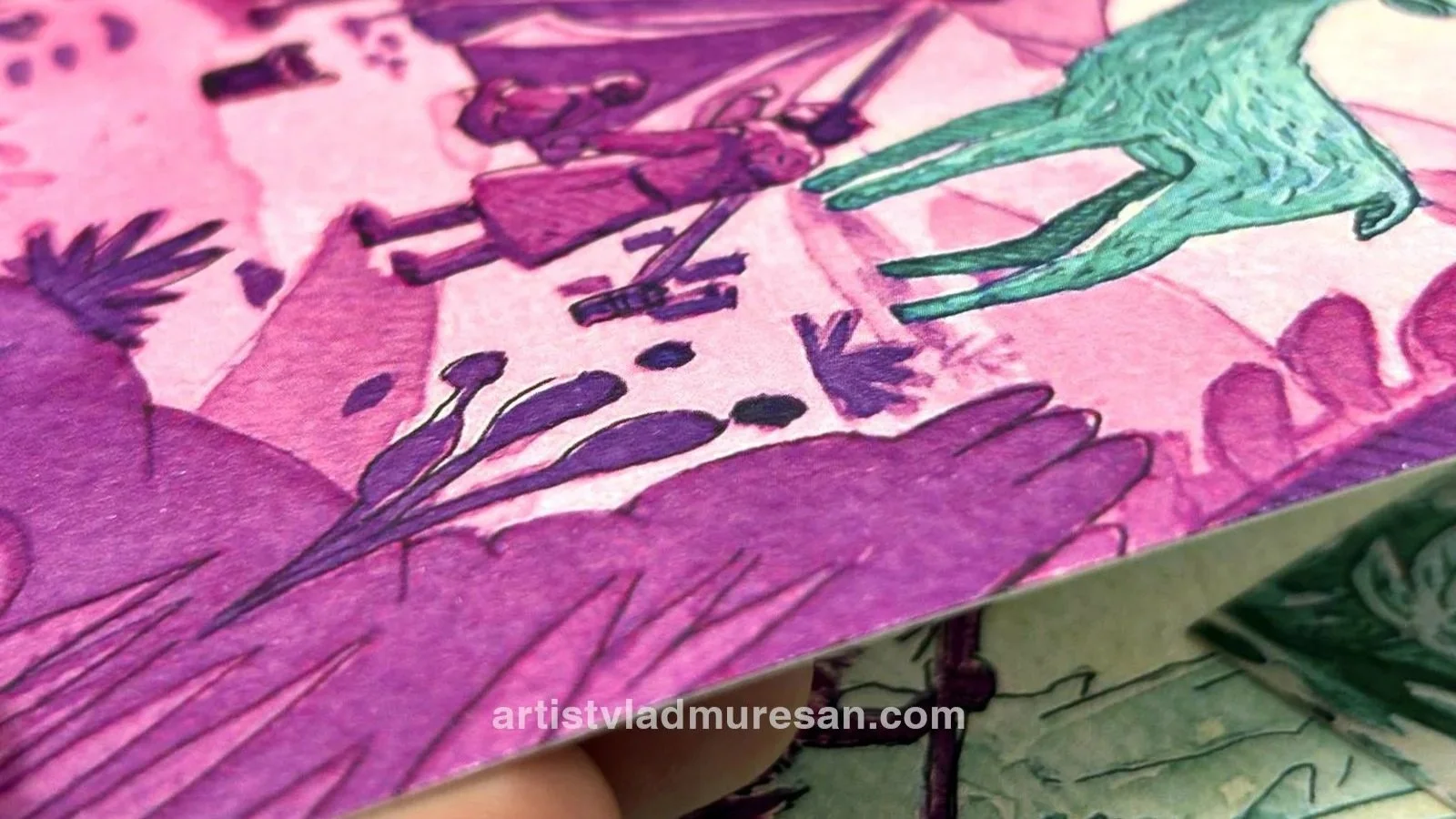 Fiecare ilustrație a pornit de la o schemă cromatică aparent contradictorie – nuanțe vibrante de roz și verde smarald – folosită pentru a masca și, ulterior, a vindeca teme dificile: nevoia complexă de familie, gestionarea vulnerabilității și recuperarea după eșec. Este o practică prin care am preluat „resturile” (momentele de respingere, deciziile greșite) și le-am rafinat până au devenit o narațiune vizuală coerentă. Nu am desenat o pădure fermecată, ci am cartografiat un proces de supraviețuire.